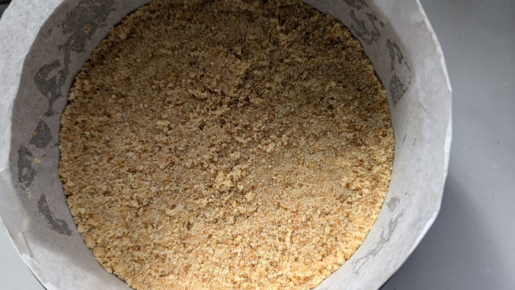 3.バターがなじんだビスケットをケーキ型の底にしっかり押し付けながら敷き詰めます。