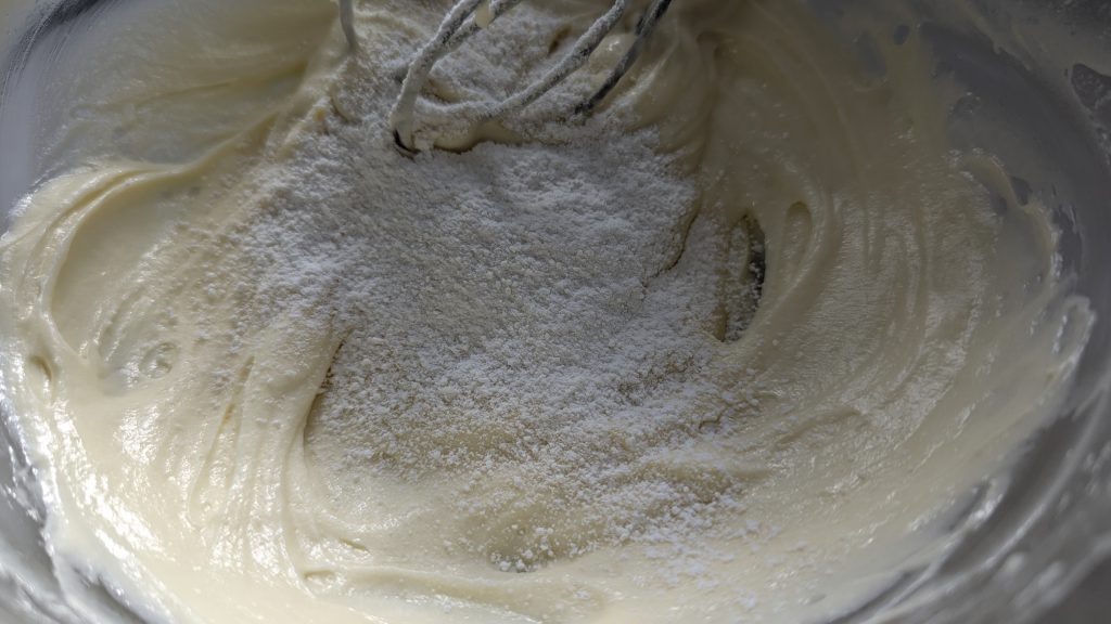 4.ボウルにクリームチーズを入れて、滑らかになるまで混ぜます。そこに砂糖、薄力粉、卵、生クリーム、レモン汁と水気の少ないものから順に加えていきます。